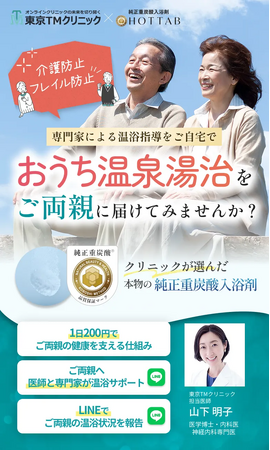 ・40代以上の方が、お子様としてご両親にお届けする、ご両親宅のお風呂を湯治現場にした新しい医療サービスです。東京TMクリニックがその効果を認めた純正重炭酸入浴剤ホットタブ((株)ホットタブ製)がご両親宅に届き、ご両親は、医師や専門の温浴指導専門家によるLINE重炭酸温浴指導・相談・診療を受けることができます。