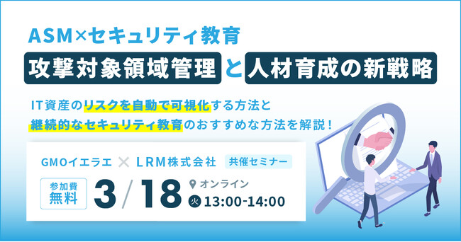 LRM株式会社(本社:兵庫県神戸市、代表取締役CEO:幸松哲也)と、GMOサイバーセキュリティ byイエラエ株式会社(本社:東京都渋谷区、代表取締役CEO:牧田誠)は、2025年3月18日(火) 13時から、IT資産のリスクを自動で可視化する方法と継続的なセキュリティ教育のおすすめ方法に関するセミナーを無料開催します。Zoomでお気軽にご視聴いただけますので、ぜひご参加ください。