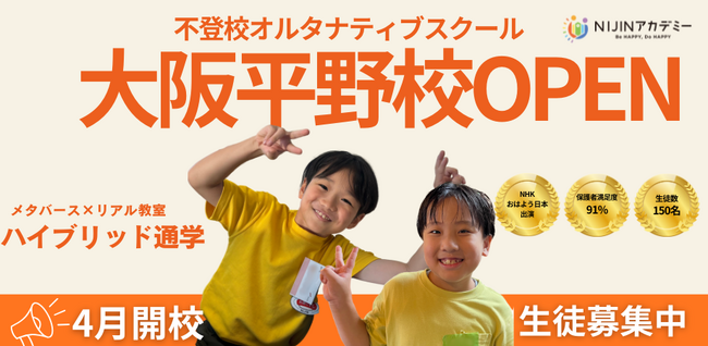 株式会社NIJIN(本社:東京都江東区、代表取締役:星野達郎)が運営する不登校オルタナティブスクール『NIJINアカデミー』はこの度、フリースクール(リアル教室)"大阪平野校”を開校することをお知らせいたします。