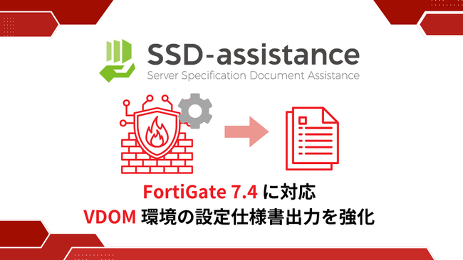 セイ・テクノロジーズ株式会社 (本社:東京都文京区、代表取締役社長:三瓶 千里) は、サーバー設定仕様書自動生成サービス「SSD-assistance」において、新たに「FortiGate」の FortiOS 7.4 及び 仮想ドメイン(VDOM) 環境に対応する最新バージョンを2025年3月17日より提供します。これにより、FortiGate の設定仕様書を自動生成する範囲が拡大し、エンジニアの手作業負担を軽減します。