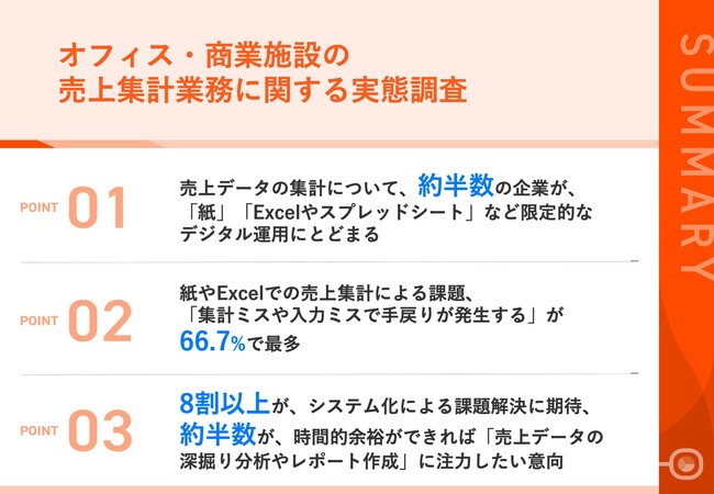 【オフィス・商業施設の売上集計業務の実態】約半数が、「紙」「Excel」など限定的なデジタル運用にとどまる 業務課題の解決に向けて、8割以上がシステム化に期待