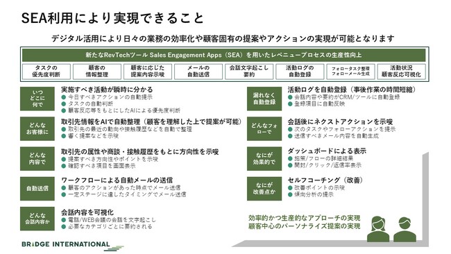 *Sales Engagement Apps(SEA)は、営業チームが顧客との関係を深め、効率的に営業活動を行うためのツールです。これらのプラットフォームは、顧客ごとに最適な提案を実現し、メールの自動化、プロセスの管理、パフォーマンスの分析など、多岐にわたる機能を提供します。