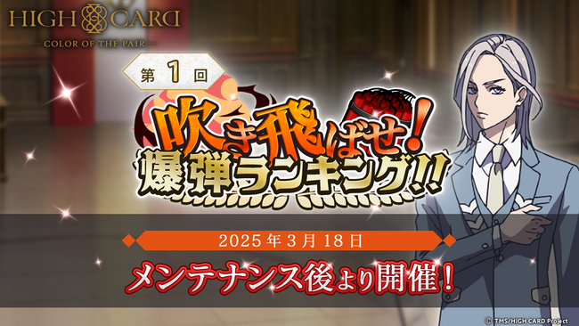 株式会社U Know Games (本社:東京都港区、代表取締役:谷口祐一郎)は、アニメ『HIGH CARD』のスマートフォン向けゲーム「HIGH CARD -Color of the Pair-」(略称:ハイカラ)にて、3月18日(火)より『ハイカラ』初のランキングイベント「吹きとばせ!爆弾ランキング!!」を実施いたしましたので、お知らせいたします。