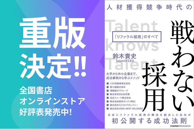 株式会社TalentX(本社:東京都新宿区、代表取締役社長:鈴木貴史)は、代表・鈴木の著書である『人材獲得競争時代の戦わない採用 「リファラル採用」のすべて』の重版が決定したことをお知らせします。