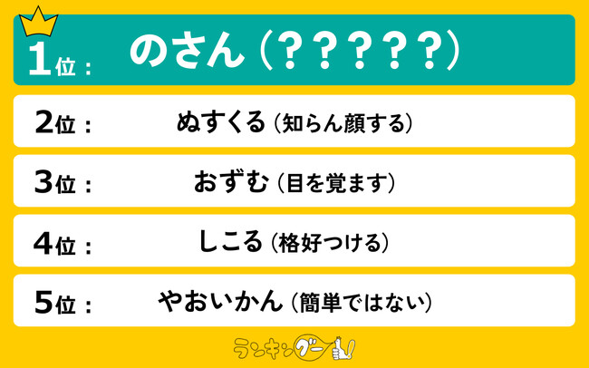 ランキングー!では意味が難しい熊本の方言をピックアップし、ランキングを調査。全年代の男女(性別回答しないを含む)8,837名にアンケートを行い、TOP10を決定しました。ここではTOP5をご紹介します。