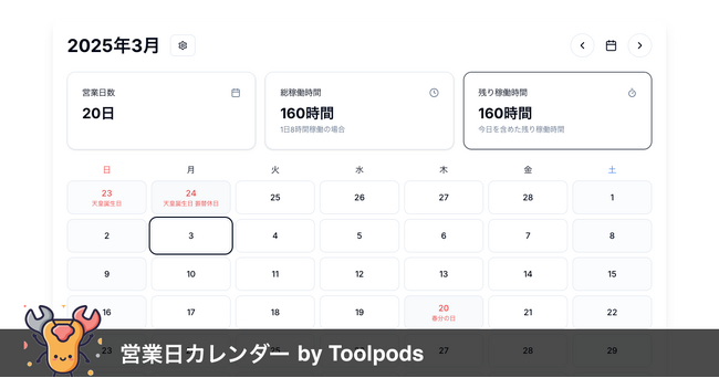 「今月の営業日はあと何日?」「残り稼働時間はあと何時間あるんだろう?」そんな疑問を持ったことはありませんか?月末に近づくほど増えるこれらの悩みを、無料で簡単に解決する新サービス『営業日カレンダー by Toolpods』が登場しました。