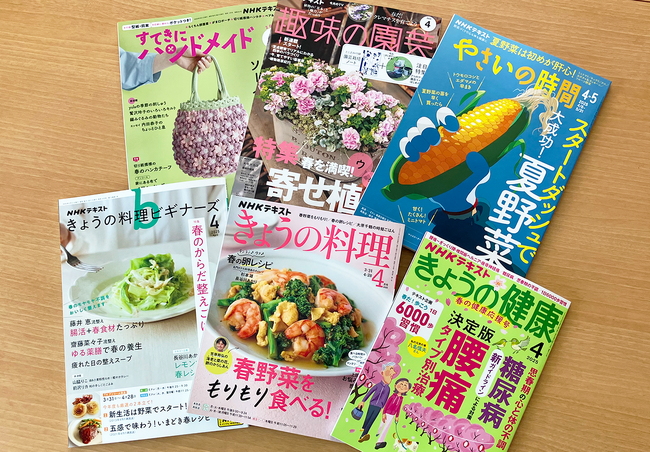NHKテキスト『きょうの料理』『きょうの料理ビギナーズ』『すてきにハンドメイド』『趣味の園芸』『やさいの時間』『きょうの健康』の4月号がNHK出版より3月21日に発売されました。