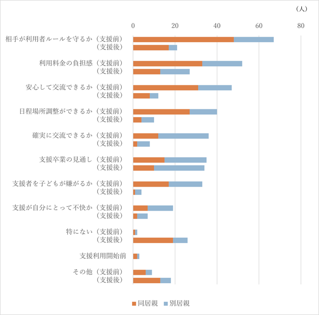 相手に対する不信感は63%から20%に、交流に関する不安感は44%から11%に、交流ができるかどうかの不安感は34%から8%に、それぞれ激減しています。支援者という第三者が入るのを子どもが嫌がるのではないかという危惧は31%から4%に減り、支援を利用して交流をおこなうことで、離別家庭の親が抱える多くの不安が大幅に低減することがわかりました。
