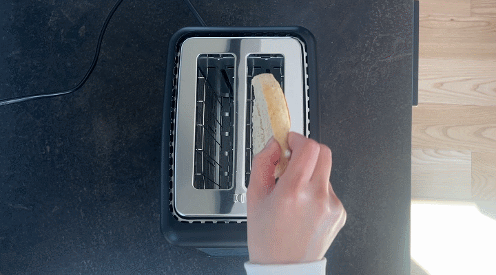 『TOASTY』は、スロットにパンを入れてレバーを引くと、左右からバーが伸びてパンを中央にしっかり固定。ヒーターとの距離が均一になるため、焼きムラが起こりにくく、端から端まで均一な焼き加減に仕上がります。どこから食べても理想の食感。最後のひと口まで、美味しく味わえます。