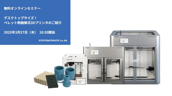 株式会社システムクリエイト(本社:大阪府東大阪市荒本新町、代表:川上正義)は、2025年3月27日(木)10:30に、無料オンラインセミナー「デスクトップサイズ!ペレット熱融解式3Dプリンタのご紹介」を開催いたします。