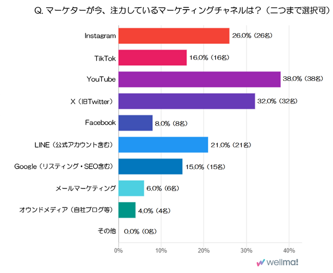 こうした現場の課題や疑問に応えるため、マーケティング担当者1万人に自社サービスや価値を直接届けられる次世代型プラットフォーム「Wellma(ウェルマ)」(https://wellma.jp/ )は、2025年3月18日にマーケター100名を対象とし「マーケターが注力しているマーケティングチャネルは?」という独自アンケート調査を実施しました。