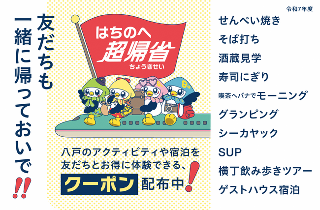 八戸市での超帰省を促進、応援することで、市および地元協力店舗のPRやイメージアップ、新たな関係人口の創出を図ることを目的に、令和7年度より新たに実施する「八戸市超帰省応援事業」の一環として「はちのへ超帰省クーポン」を実施します。