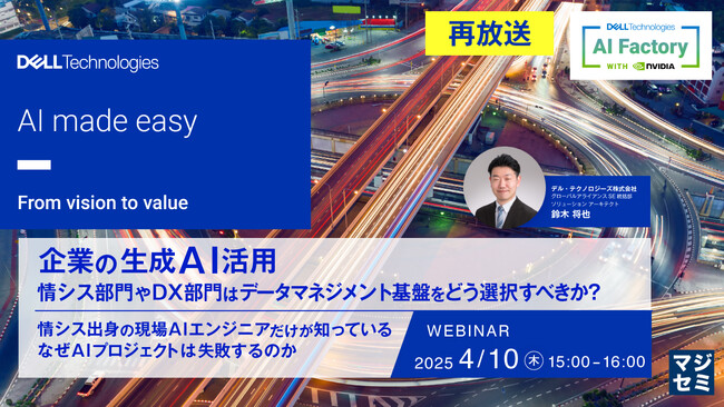 マジセミ株式会社は、「【再放送】企業の生成AI活用、情シスやDX部門はデータマネジメント基盤をどう選択すべきか?」というテーマのウェビナーを再放送します。