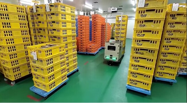 写真1:GEクリエイティブ社 AMR『YT-350F』が食品工場内でドーリー台車を搬送する様子(写真提供:GEクリエイティブ社)