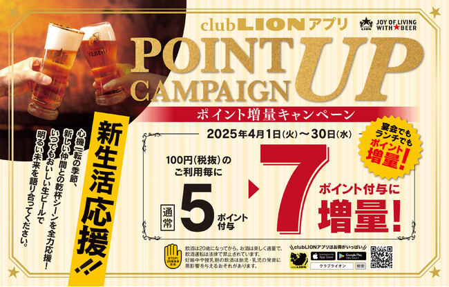サッポロホールディングスのグループ企業で、ビヤホール・レストランなどを運営している株式会社サッポロライオン(本社・東京都中央区、社長・三宅祐一郎)は、全国のサッポロライオンチェーン(一部店舗除く)でご利用いただけるポイントサービス「club LION ポイント」の増量キャンペーンを2025年4月1日(火)~4月30日(水)に実施します。