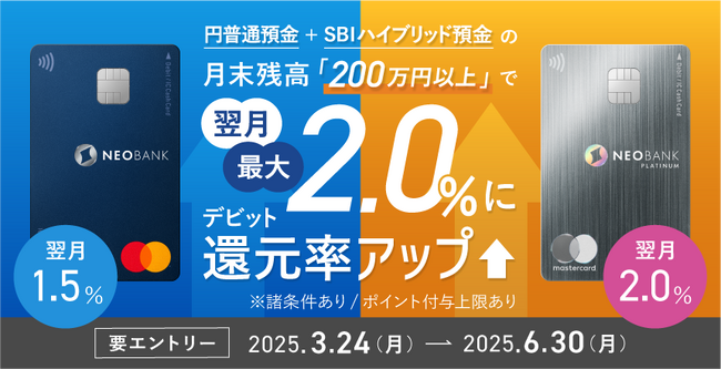 住信SBIネット銀行株式会社(本社:東京都港区、代表取締役社長(CEO):円山 法昭、以下「住信SBIネット銀行」)は、2025年3月24日(月)から「3ヵ月連続!月末円普通預金残高(*1)200万円以上で翌月の対象デビットカードポイント還元率アップキャンペーン」を開始したことをお知らせします。