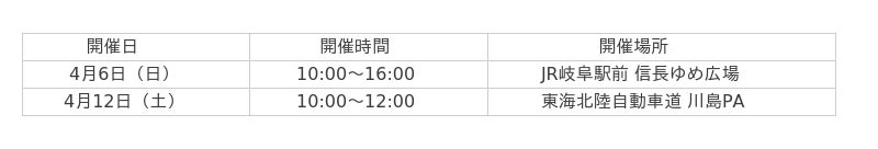 JAF(一般社団法人日本自動車連盟)岐阜支部(支部長 加藤元康)は、「春の全国交通安全運動」(4月6日(日)~15日(火))の期間中、4月6日(日)JR岐阜駅前 信長ゆめ広場(岐阜市橋本町)、4月12日(土)東海北陸自動車道 川島パーキングエリア(各務原市川島笠田町)で、岐阜県や岐阜市などと協力して交通安全啓発活動をおこないます。
