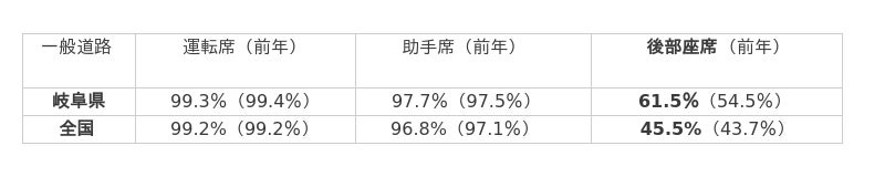 岐阜県の後席シートベルト着用率は一般道路61.5%(前年54.5%)、高速道路90.1%(同85.4%)でした。また、全国平均は一般道路45.5%(前年43.7%)、高速道路79.7%(同78.7%)の結果でした。2008年に後席シートベルト着用が義務化され15年以上が経過しましたが、岐阜県は全国平均を上回っているものの、依然として運転席・助手席と比べると着用の意識が低いことを示しています。