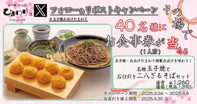 この度、玉子焼・お出汁ひまわり公式Xアカウントとフォロー&リポストして応募すると、抽選で40名様に「名物玉子焼と石臼引き二八ざるそばセット1人前(税込み1,390円)」をお召し上がりいただけるデジタルお食事券プレゼントキャンペーンを2025年3月26日(水)より開催します。この機会にぜひご応募ください。