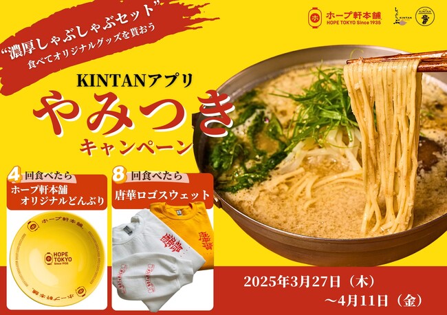 ホープ軒本舗×しゃぶしゃぶKINTANのコラボを記念し、3/27(木)~4/11(金)の期間中、「吉祥寺背脂豚骨醤油スープの濃厚しゃぶしゃぶセット」をご注文いただいた回数に応じて「吉祥寺 ホープ軒本舗」オリジナルグッズが必ず貰えるアプリスタンプキャンペーンを開催いたします。