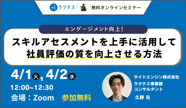 【人事・教育担当者必見】 複数日程で開催!スキルアセスメントを社員評価に活用する方法をお伝えする無料セミナー|スキルチェックツールの「ラクテス」