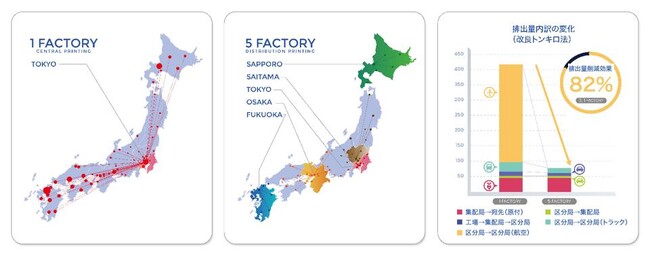 本実証実験では、当社が保有するルーティング技術と、グーフ独自のデジタルプリンティングプラットフォームを活用し、「適地生産」を行った際の輸送時におけるCO2排出量削減効果の可視化と、その有用性の精査・検証を行います。第一弾として、実在するEC企業のデータを基に実施したDM(ダイレクトメール)輸送時のシミュレーションでは、適地生産(1拠点→5拠点)を行った場合に最大82%のCO2削減が見込めることが分かりました。