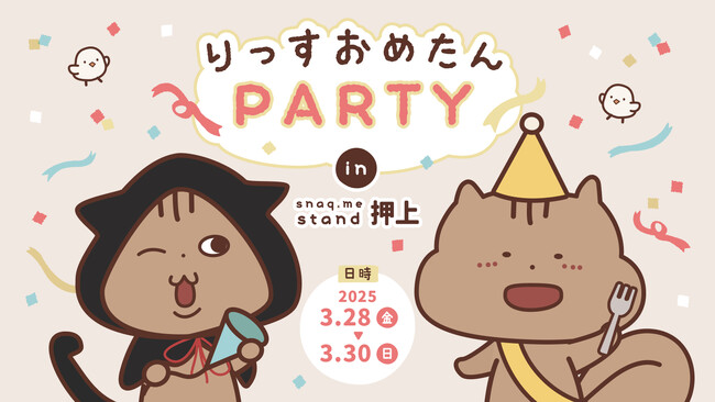 2025年3月28日から3日間限定で、「snaq.me stand(スナックミースタンド)押上」にて、りっすのお誕生日を記念して「りっすおめたんPARTY」を開催します。