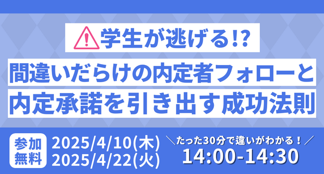 ◆多くの企業が考える、誤った「内定者フォローの常識」◆「自社が滑り止めにされている…」「ちゃんとフォローしてるのに学生が離れていく…」 こんな悩み、ありませんか?実は、内定者フォローのやり方を間違えると逆に学生の不安を煽って辞退を加速させてしまうことも…このセミナーでは、学生が辞退する本当の理由を事例をもとに解説。企業がやりがちな「学生が離れるフォロー」と、「学生が決断したくなるフォロー」の違いをお伝えします。さらに、内定承諾率を上げるために企業がやるべき「たった1つの重要なアクション」も大公開!LINEやSNSを使った最新のフォロー方法など、すぐに実践できるノウハウをお届けします。