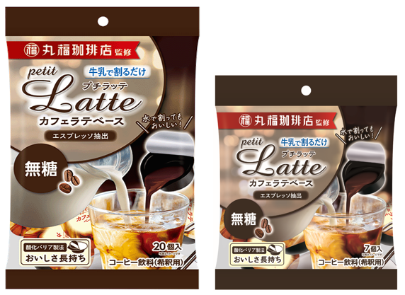 牛乳で割るだけで老舗喫茶店の味わい『丸福珈琲店監修 プチラッテ カフェラテベース/抹茶ラテベース』をリニューアル!無糖は大容量20個入りタイプも!
