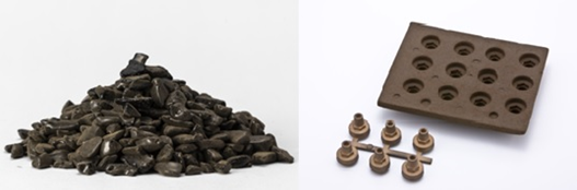 図1 固形ノボラック型リグニン変性フェノール樹脂(左)と 鋳型製造用途の使用例(右)
