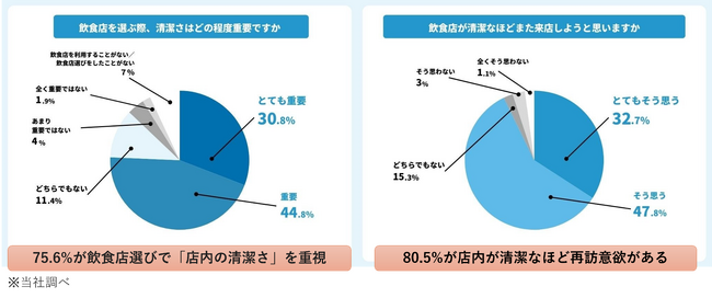 リ・プロダクツが実施したアンケート調査では、飲食店を選ぶ際に「店内の清潔さ」を重視する人が75.6%に上ることが分かりました。さらに、「飲食店が清潔なほど再訪意欲が高まるか」という問いには、80.5%が「清潔な店ほど再訪意欲がある」と回答しました。この調査結果は、飲食業界においてクレンリネス(清潔さ)の向上が顧客満足度や店舗に直結する重要な要素であることを示しています。