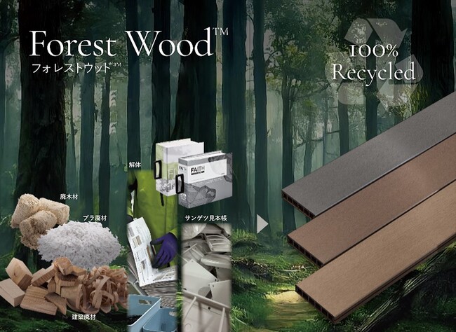 株式会社サンゲツ(本社:愛知県名古屋市、代表取締役 社長執行役員:近藤 康正、以下:サンゲツ)と、ミサワホーム株式会社(本社:東京都新宿区、代表取締役 社長執行役員:作尾 徹也、以下:ミサワホーム)は、100%リサイクル原料の人工木ウッドデッキ「フォレストウッド(TM)」を共同開発しました。「フォレストウッド(TM)」は、ミサワホームが取り扱う再生木材とリサイクルチップに、サンゲツの発刊する商品カタログ(以下、見本帳)の部材を一部使用した、アップサイクルのエクステリア商品です。当該商品は2025年度に発売を予定しており、サンゲツは今後、エクステリア商品の拡充・強化を進め、幅広い市場に向けて販売していきます。