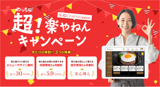 株式会社イグレック(大阪市西区、代表取締役:新田 秀幸、以下 イグレック)は、飲食店向け一元管理システム「IG OneFlow(アイジーワンフロー)」の発売を記念して、2025年4月1日よりIGREKセルフオーダー導入キャンペーン「超!楽やねんキャンペーン」を開催することをお知らせします。本キャンペーンは、2025年4月1日から2025年4月30日の期間中にIGREKセルフオーダーをご契約いただきました飲食店様を対象に『【最大30万円分】メニューデザイン無料』『【最大5.9万円分】月額費用3ヵ月無料』『【安心導入】保守費用3ヵ月無料』の3つの特典を提供するとてもお得なキャンペーンです。本キャンペーンをご活用いただくことで、特許取得済みの完全フリーレイアウトデザイン機能を備えた「IGREKセルフオーダー」を特別価格30万円※で導入いただけます。