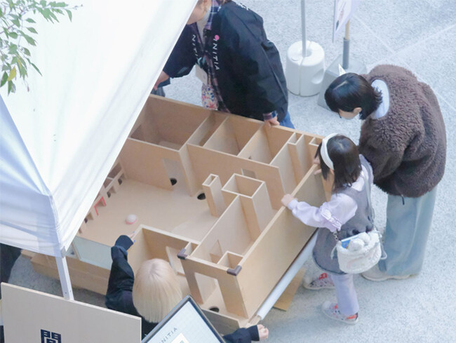 当日は、世代や性別を問わず住宅を身近に感じていただけるようにと、間取りをモチーフにした「イニシアの間取り転がしゲーム」を実施し、イベントに来場された方々のうち、約350組の方にご体験いただきました。また、ゲームをクリアした方には、実際に当社のリノベーションマンションの建材で利用している、環境に配慮した間伐材からできたおもちゃや、マイクロプラスチックをアップサイクルしたカラビナキーホルダーなどをプレゼントいたしました。