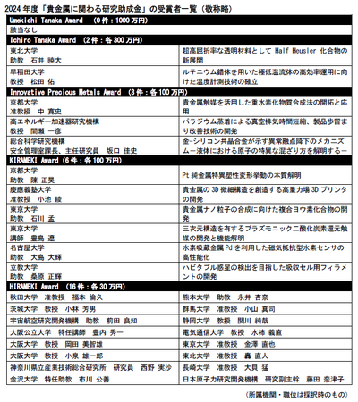 その他「Innovative Precious Metals Award」3件、「KIRAMEKI Award」6件、「HIRAMEKI Award」16件、および本助成金実施概要については、次の通りです。なお、2025年度の研究助成金については、今秋に募集を開始する予定です。