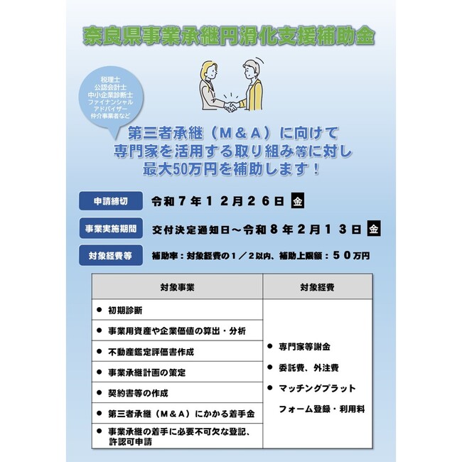 「奈良県事業承継円滑化支援補助金」 公募のお知らせ