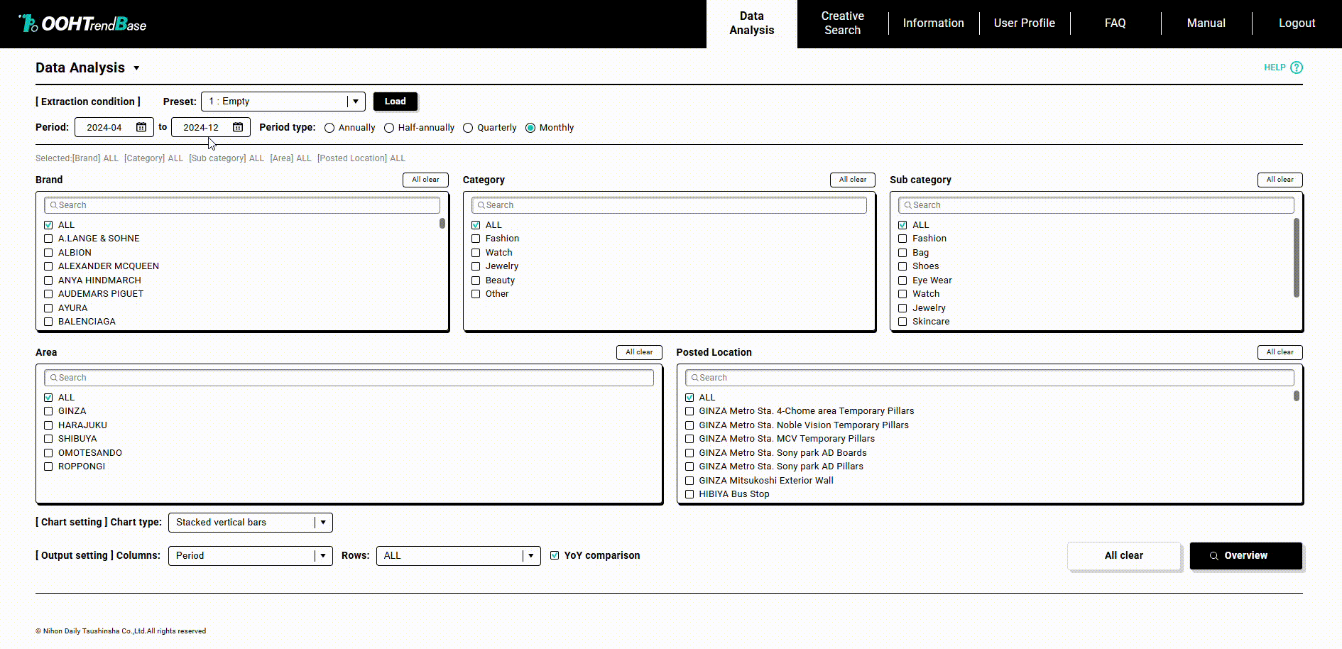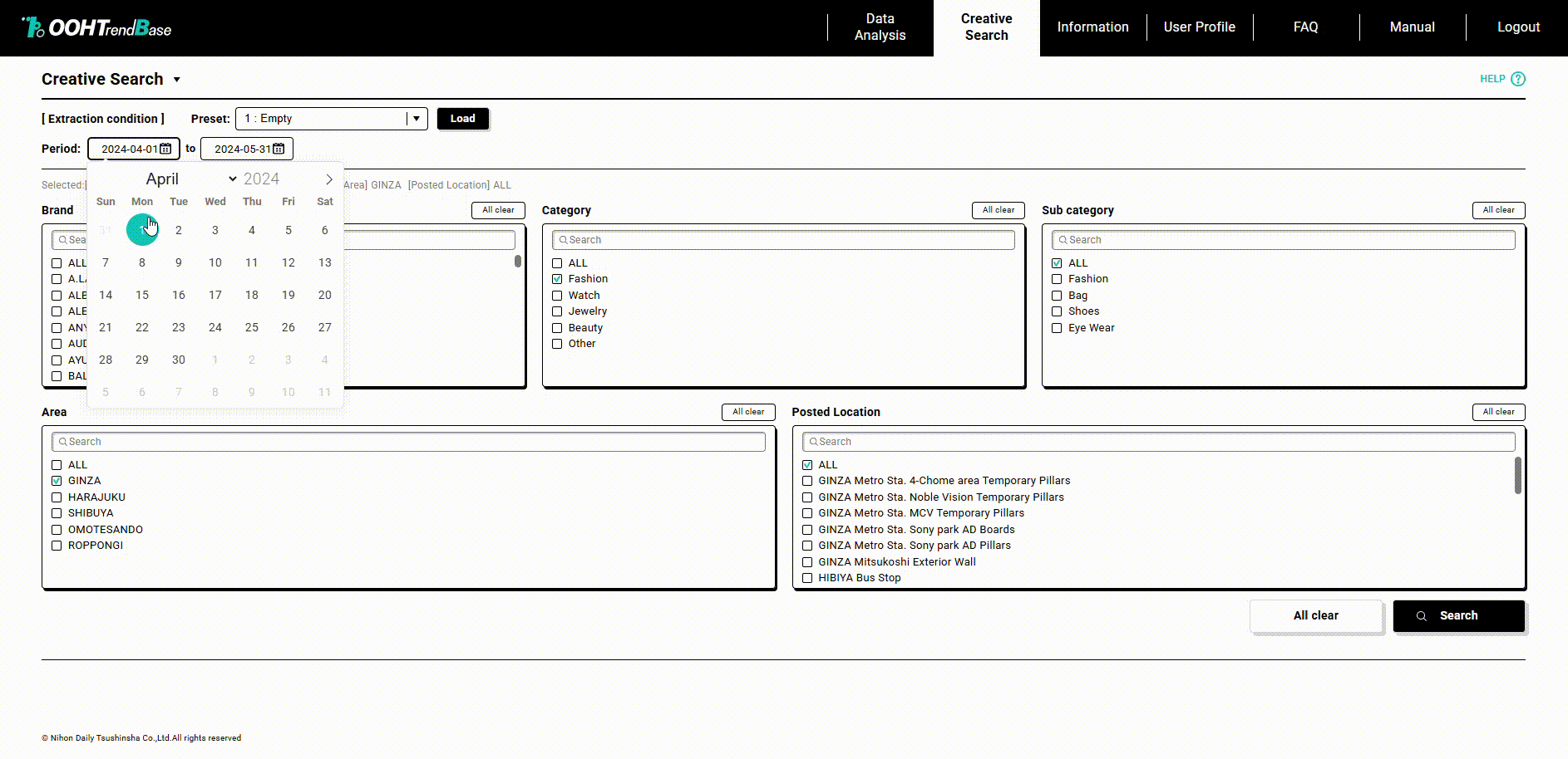 ・OOH TrendBaseは屋外広告の統計データ・画像システムで、表参道、渋谷、原宿、銀座、六本木を中心に、流行の先端となる都内主要約80地点を毎週モニタリングし、広告画像、出稿情報、媒体費等をデータベース化