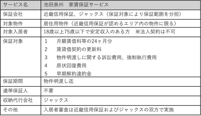 株式会社ジャックス(本部:東京都渋谷区、代表取締役社長:村上 亮、以下「ジャックス」) は、株式会社池田泉州ホールディングス(本社:大阪府大阪市、代表取締役社長兼 CEO:鵜川 淳、以下「池田泉州ホールディングス」)のグループ会社である近畿信用保証株式会社(本社:大阪府大阪市、代表取締役:井上 愼治、以下「近畿信用保証」)と連携し、2025年4月1日より「池田泉州 家賃保証サービス」の取り扱いを開始いたします。