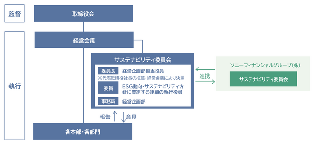 サステナビリティ委員会は、親会社のソニーフィナンシャルグループ株式会社と連携をとり、ステークホルダーの皆さまからの期待や要請を踏まえたサステナビリティに係る方針・戦略、取組状況等について、全社横断的に協議・推進し、サステナビリティへの取組のさらなる強化を図ります。