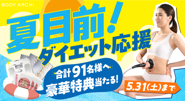 「ドクターズ セルフエステ BODY ARCHI」を展開する株式会社ボディアーキ・ジャパン(本社:東京都渋谷区、代表取締役:滝 浩介、以下 BODY ARCHI)は、対象期間内にご入会いただいた方の中から抽選で91名様に豪華賞品が当たる「夏目前!ダイエット応援キャンペーン」を開催いたします!