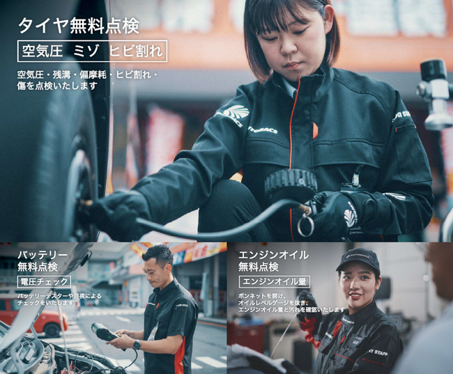 オートバックスグループ店舗では、常時、安全・安心なドライブのためのタイヤ、オイル、バッテリー、ワイパーなどの無料安全点検を行っています。