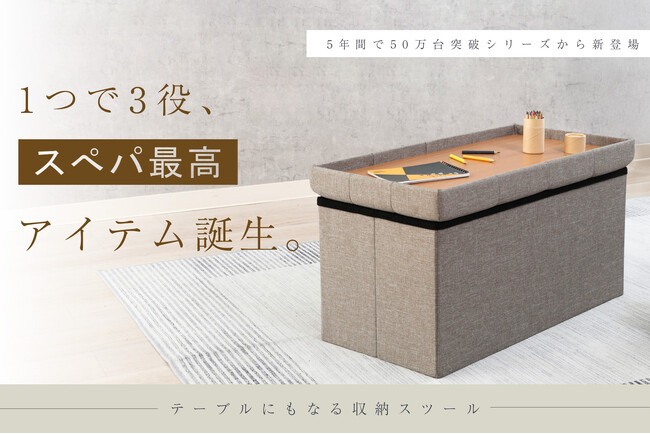 「収納スツール ハント」5年で50万台突破。さらに進化した『テーブルにもなる 収納スツール』も新登場。