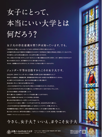 18歳人口が2035年には97万にまで減少すると見込まれている今、女子大学の存在意義を問う声も聞かれます。本広告では、学内のステンドグラスを使用したデザインを背景に、共学・大規模大学志向が強まる中、女子教育、小規模大学の意義を再定義し、あえて女子大として存在し続ける意思表明を新聞広告1面で展開しました。なお、掲載した3月8日は、国連がジェンダー平等の実現を目指す『国際女性の日』と定めた日です。