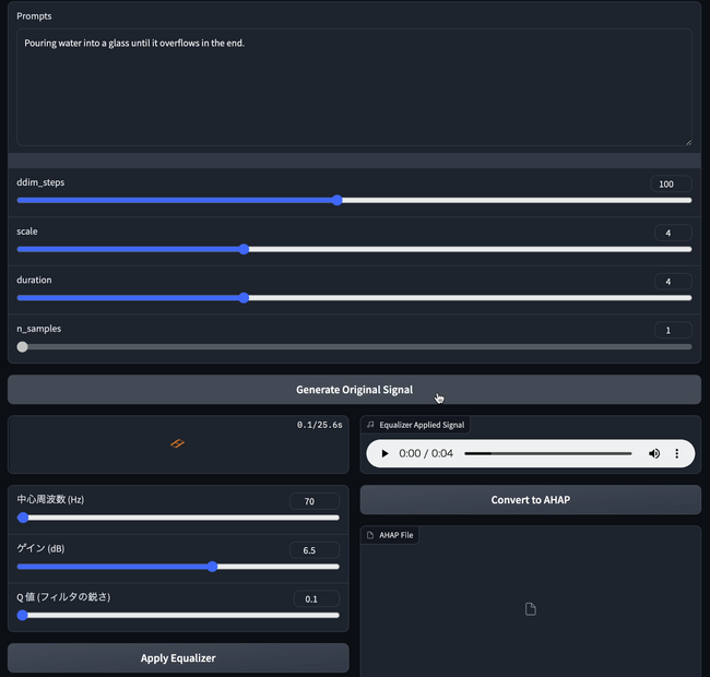 「Hapto AI」は、日常的な言葉などの自然言語から簡便に触覚を生成できるAI基盤です。現在、開発を開始しており、様々な触覚体験の生成の実証実験をしています。