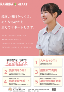 このたび同大は、2026年度入学生にも「入学金・受験料0円」「授業料70万円」制度を適用することを決定。「患者さまに寄り添いサポートしたい」「保健医療の向上に寄与したい」思いを持つ学生へ看護の道という門戸を広げるべく、亀田医療大学では2026年度入学生を以下の5つのポイントで迎える。