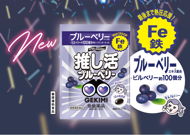 第二弾として発売する「GEKIMI推し活サプリ」は、「GEKIMI推し活エナジードリンク」と同じく1袋にブルーベリーエキス(ビルベリー約100個分)を配合したサプリメントです。