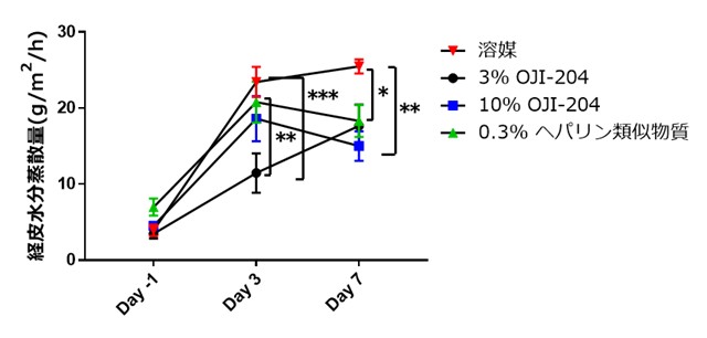 乾燥肌モデルマウスにおいて、溶媒群(赤)と比較して有意にOJI-204群(黒及び青)では皮膚バリア機能が改善した。乾燥肌モデルマウス誘導開始3日目においては、ヘパリン類似物質群(緑)よりも3% OJI-204群は有意に経皮水分蒸散量(TEWL)が低下した。