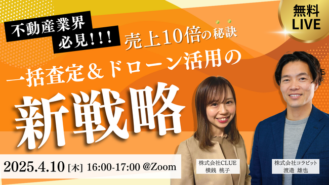 株式会社CLUE(https://corp.t-clue.com/ 東京都港区 代表取締役 阿部亮介 以下「CLUE」)と株式会社コラビット(https://collab-it.net/ 東京都港区 代表取締役 浅海 剛 以下「コラビット」)は、4月10日(木)16:00より、【不動産業界必見】売上10倍の秘訣!一括査定&ドローン活用の新戦略セミナーを開催いたします。