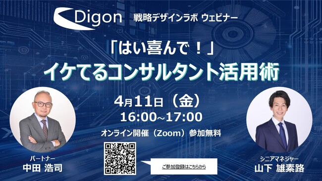 株式会社マイネット(東京都港区、代表取締役社長:岩城 農)は、デジタルトランスフォーメーション(DX)やシステム開発を得意とするDigon株式会社(本社:東京都、代表取締役:岩城 農)が、2025年4月11日(金)16時より、ウェビナー『Digon戦略デザインラボ ウェビナー:「はい喜んで!」イケてるコンサルタント活用術』を開催することをお知らせいたします。