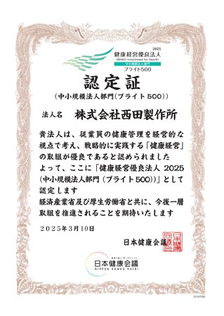 [株式会社西田製作所](本社:京都市伏見区久我西出町1-15、代表取締役:民 理恵)は、2025年3月10日、経済産業省と日本健康会議が推進する「健康経営優良法人制度」において「健康経営優良法人2025 中小規模法人部門ブライト500」に認定されました。